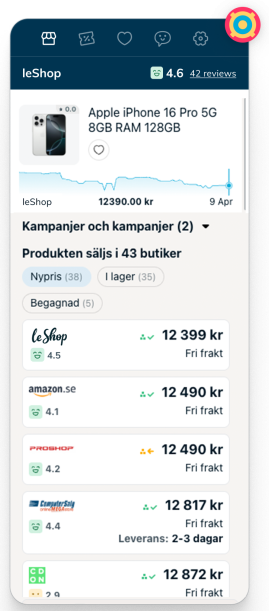 Installera Prisjakt Autopilot: vårt nya browsertillägg i Chrome som automatiskt jämför priset, direkt i nätbutiken. Så hittar du rätt sak till rätt pris, varje gång.